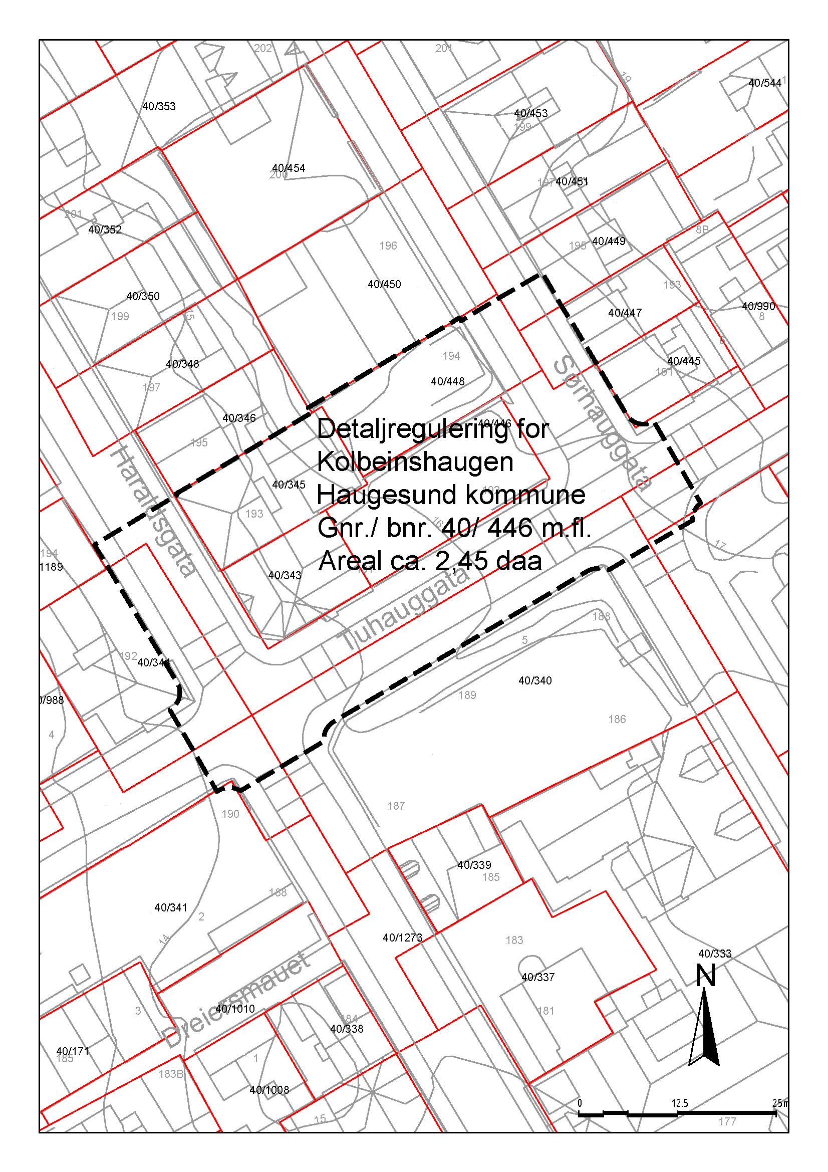 Planområdet ligger nord i Haugesunds sentrumskvadratur. Tomten består av fire eiendommer som ligger i sørenden av et bykvartal, innrammet av Haraldsgata, fylkesvegen Tuhauggata og Sørhauggata. Kommunen har bedt om at trafikkarealer rundt eiendommene ble tatt med, for å sikre en helhet i planarbeidet. Planavgrensningen utgjør 2,45 dekar. Planavgrensningen omfatter helt eller delvis gnr. 40, bnr. 343, 345, 446, 448 og vegareal 340, 344, 445, 447, 449 og 1282.